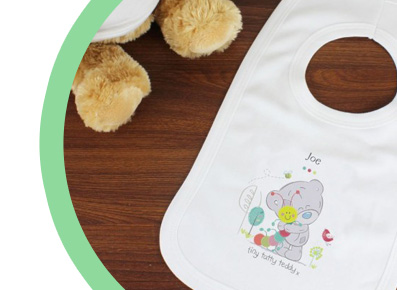 We have a variety of designs for baby girls and baby boys that can all be personalised with names, dates and messages to make a unique bib for your own child or as a gift for a friend or family member with a newborn.