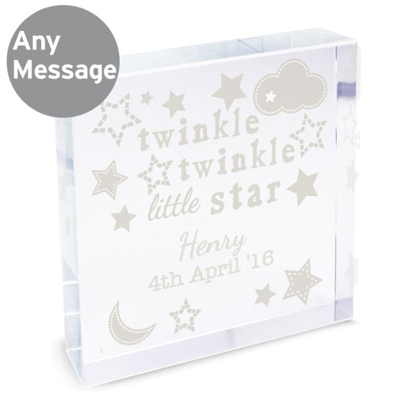 Personalise this Twinkle Twinkle Crystal Token with a message over 2 lines of up to 20 characters per line. "twinkle twinkle little star" is a fixed part of the design. All personalisation is case sensitive and will appear as entered.