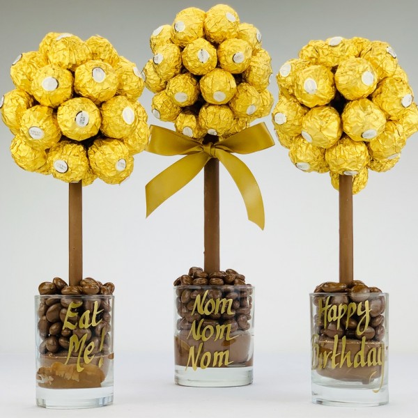 This luxurious, handmade Sweet Tree is the chocolate box with a difference. Enjoy with friends and family after dinner over a cup of coffee. Edible to the core, the centre of this Sweet Tree is made from our secret recipe Belgian chocolate crispy crunch. Then one-by-one Ferrero Rocher is stuck by hand to the centre of the Sweet Tree using even more chocolate. So, once you've made your way through all the Ferrero, keep on munching! The Ferrero Sweet Tree is potted in a glass vase that can be personalised with the message of your choice, handwritten in gold script. The vase is then filled with yummy chocolate coated raisins – this is the edible soil in which the Sweet Tree is planted! Like all trees, the Sweet Tree trunk is made from wood, so please do not attempt to eat this! However, the trunk is set in the bottom of the vase using solid Belgian chocolate. Small 25cm (suitable for 1 -3 person) – Large 35cm (4 – 6 persons) For no extra cost, you can have this personalised with a set message of "Happy Birthday" or the seasonal set message. Or you may have any name or message of your choice (up to 25 characters) written on the glass. Ribbon colour is randomly selected and may vary from that shown in the image. If you require a specific colour ribbon please enter this in our "Order Notes" section at the checkout. Stays fresh for up to 4 months if stored in its original packaging.