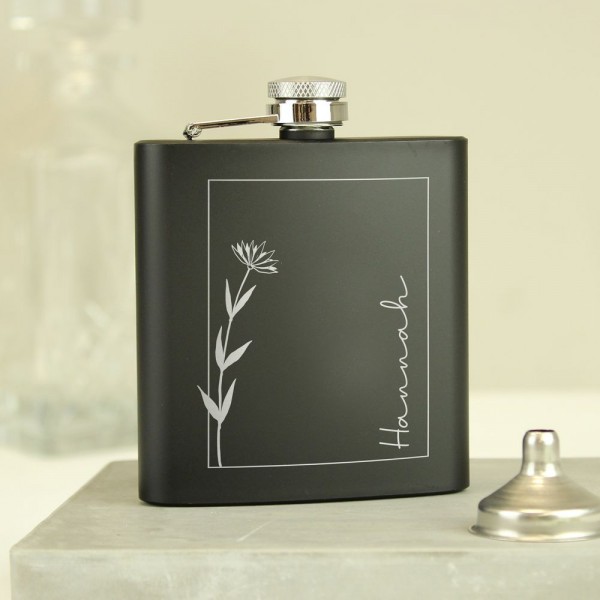 Personalised Monochrome Floral Wedding Party Black Hip Flask