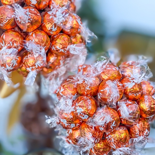 The ever-popular Lindt Lindor, now available in orange flavour- because who doesn't love chocolate orange at Christmas? The perfect gift for a chocolate orange-lover, or ideal as a dessert centrepiece to be enjoyed with friends and family after Christmas Dinner. Each 25cm Tree holds 35 Lindor! Edible to the core, the centre of this Sweet Tree is made from our secret recipe Belgian chocolate crispy crunch. Then one-by-one the Lindor are stuck by hand to the centre of the Sweet Tree using even more chocolate. So, once you've made your way through all the Lindor, keep on munching! Each 25cm Tree holds 35 Lindor! The vase is filled with yummy chocolate coated raisins- this is the edible soil in which the Sweet Tree is planted! Like all trees, the Sweet Tree trunk is made from wood, so please do not attempt to eat this! However, the trunk is set in the bottom of the vase using solid Belgian chocolate. Small 25cm / Approx. 35 Lindor (suitable for 1 -3 person) – Large 35cm / Approx. 48 Lindor (4 – 6 persons) For no extra cost, you can have this personalised with a set message of "Happy Birthday", the seasonal set message, or any name or message of your choice (up to 25 characters) written on the glass. Ribbon colour is randomly selected and may vary from that shown in the image. If you require a specific colour ribbon please enter this in our "Order Notes" section at the checkout. Stays fresh for up to 4 months if stored in its original packaging.