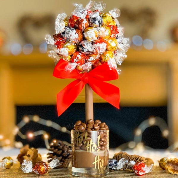 A Sweet Tree covered in mixed Lindt Lindors – decadent and delicious! This luxurious, handmade Sweet Tree is the chocolate box with a difference. Pass it around friends and family after dinner, but make sure you're not last in line to pull off your favourite chocolate! Edible to the core, the centre of this Sweet Tree is made from our secret recipe Belgian chocolate crispy crunch. Then one-by-one a mixture of Lindor, including milk chocolate, white chocolate, dark chocolate and hazelnut chocolate, are stuck by hand to the centre of the Sweet Tree using even more chocolate. So, once you've made your way through all the Lindors, keep on munching! The Lindt Lindor Sweet Tree is potted in a glass vase that can be personalised with the message of your choice, handwritten in gold script. The vase is then filled with yummy chocolate coated raisins – this is the edible soil in which the Sweet Tree is planted! Like all trees, the Sweet Tree trunk is made from wood, so please do not attempt to eat this! However, the trunk is set in the bottom of the vase using solid Belgian chocolate. Small 25cm (30 truffles) – Large 35cm (48 truffles). For no extra cost, you can have this personalised with a set message of "Happy Birthday" or the seasonal set message. Or you may have any name or message of your choice (up to 25 characters) written on the glass. Ribbon colour is randomly selected and may vary from that shown in the image. If you require a specific colour ribbon please enter this in our "Order Notes" section at the checkout. Stays fresh for up to 4 months if stored in its original packaging.