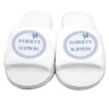 You can personalise this hotel/spa style pair of open toe slippers with 2 lines of text, with up to 12 characters per line.