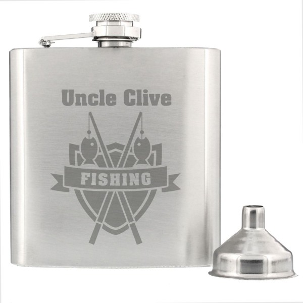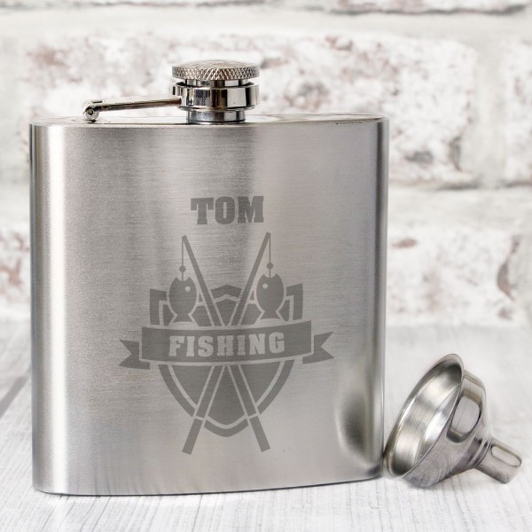 You can personalise this Hip Flask with a name up to 12 characters which will appear at the top. The word "FISHING" is fixed text.