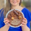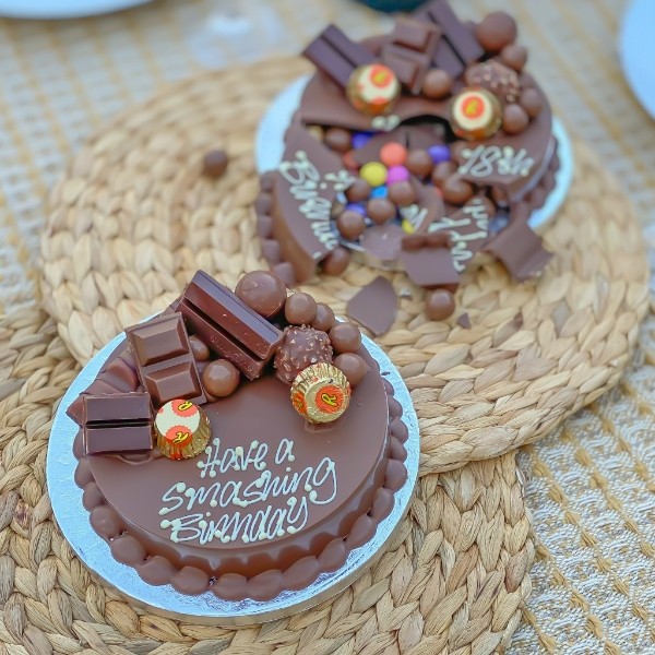 The Mini Chocoholic Smash Cake is the ultimate Birthday treat for chocolate-lovers who can't get enough of the sweet stuff!! Our Chocoholic Smash Cake is the Birthday Cake with a difference. Firstly, it's not actually a cake… sorry for the confusion. It's much better than that! This Smash Cake is made from a deliciously creamy Belgian chocolate shell. The inside contains Maltesers, Chocolate Buttons and Smarties. The outside of the cake is topped with a mound of even more heavenly chocolates including Ferrero, Lindor, Bueno, Yorkie, KitKat Chunky, Reeses Peanut Buttercups…. oh, and more Maltesers!! Now for the fun… SMASH the cake like a piñata, and watch all the chocolatey goodness tumble out! Each cake can be personalised with a message, handwritten in Belgian white chocolate. For no extra cost, you can have the Smash Cake personalised with a set message of "Happy Birthday" or the seasonal set message. Or you can have a name or message of your choice (up to 25 characters) written on the Smash Cake. Stays fresh for up to 4 months if stored in its original packaging.