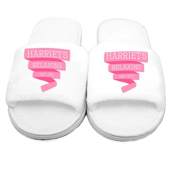 You can personalise this hotel/spa style pair of open toe slippers with 3 lines of text up to 12 characters per line. The same personalisation will appear on both slippers. All personalisation will appear in UPPERCASE.