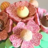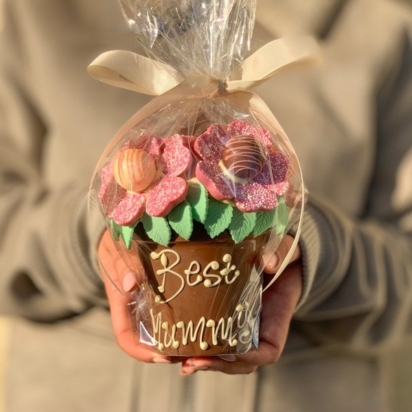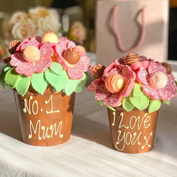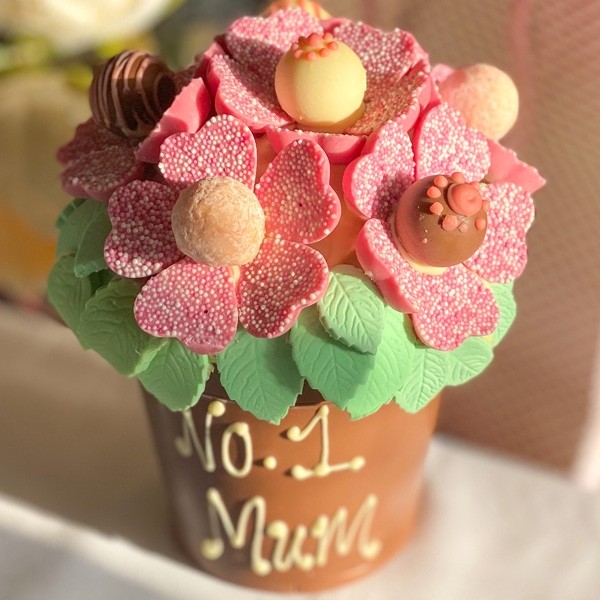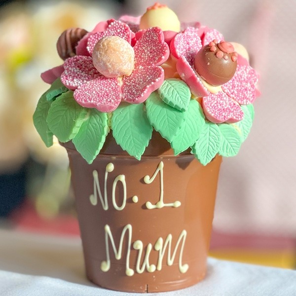 Elegant handmade Belgian chocolate flower pot containing mini marshmallows and chocolates.
