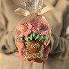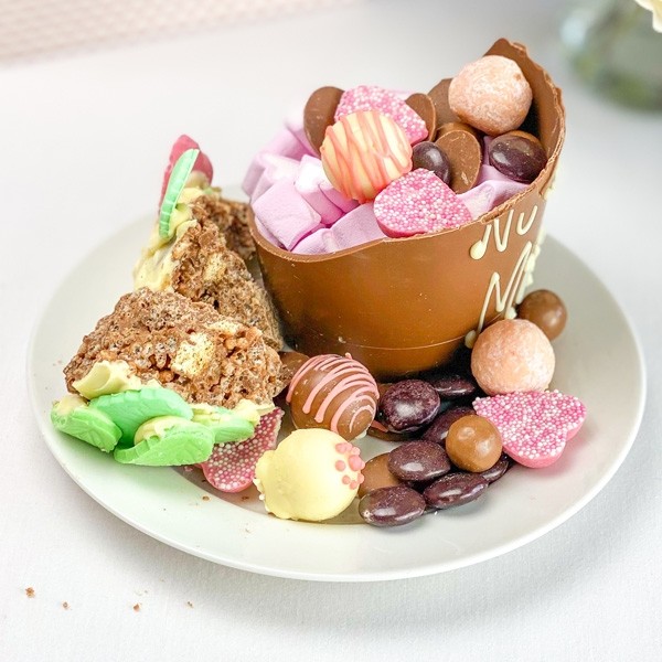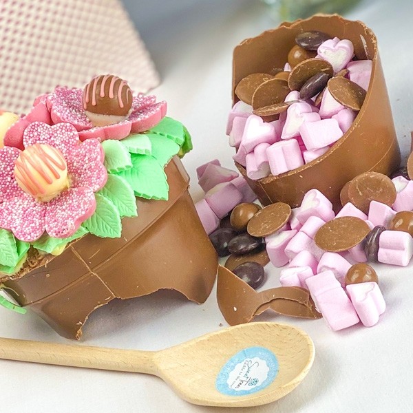 This flower pot is made from Belgian milk chocolate and contains a mixture of Maltesers, Cadbury's Buttons and Minstrels before being sealed with our secret recipe Belgian chocolate crispy crunch. Our Pink Flower Pot is hand-decorated with Jazzie Hearts and an assortment of Lindor flavours. Edible leaves give the final touches to bring this plant to life. Smash the flower pot and watch all the sweets tumble out!